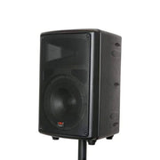 Features of the TQ8X include a built-in 150-watt amplifier with an 8″ woofer, 1″ horn, two XLR / 1/4″ combo inputs each with their own volume control, Stereo RCA inputs, and one AUX 1/8″ input with shared volume control, 3-band EQ with master volume control, and built-in media player with Bluetooth®. The built-in media player enables playing audio from a USB thumb/stick drive or from a Bluetooth® enabled device. Features also include a 5 volt USB charger port, an integrated handle for easy transportation, and a 1-3/8″ (35 mm) speaker pole socket for stand mounting.
